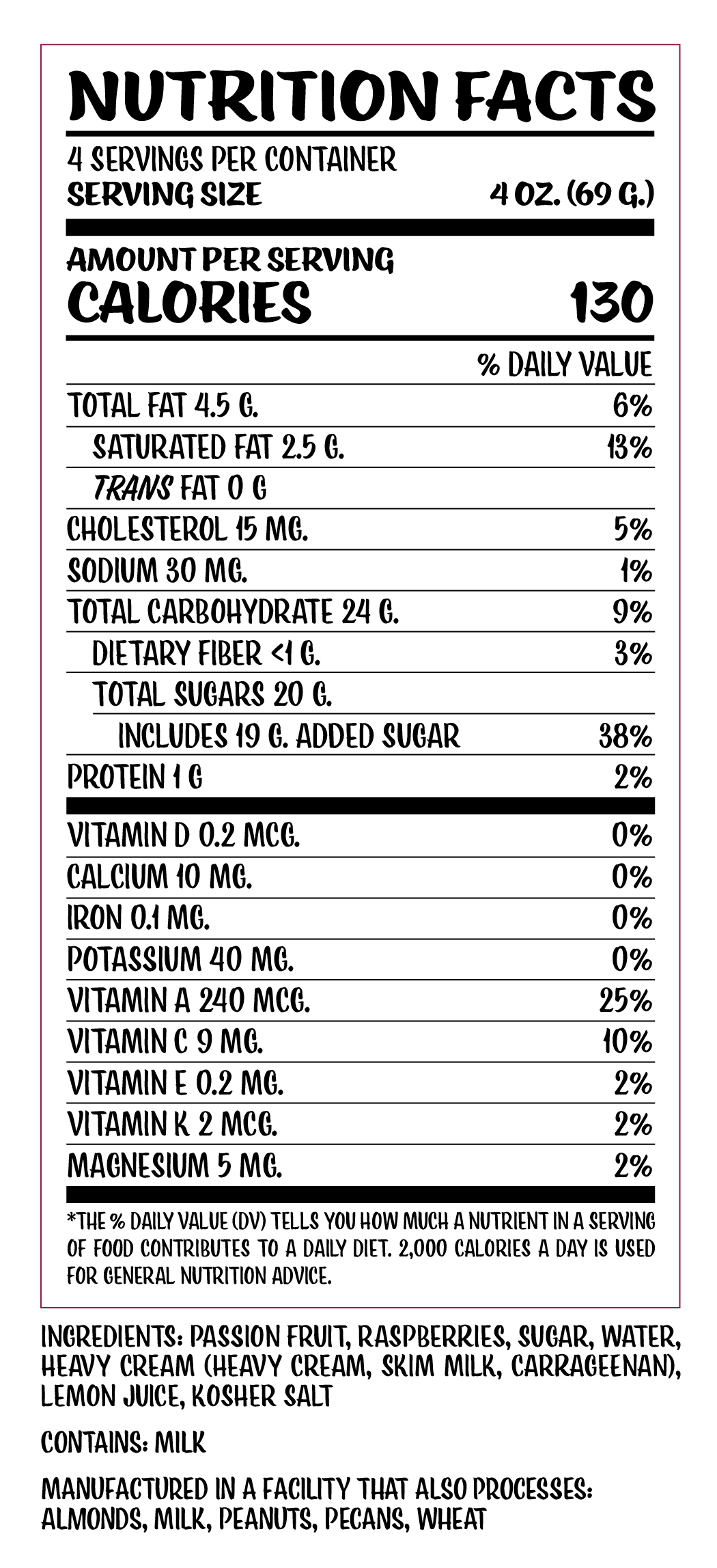 passion fruit, raspberries, sugar, heavy cream (heavy cream, skim milk, carrageenan), water, lemon juice, vodka, salt.