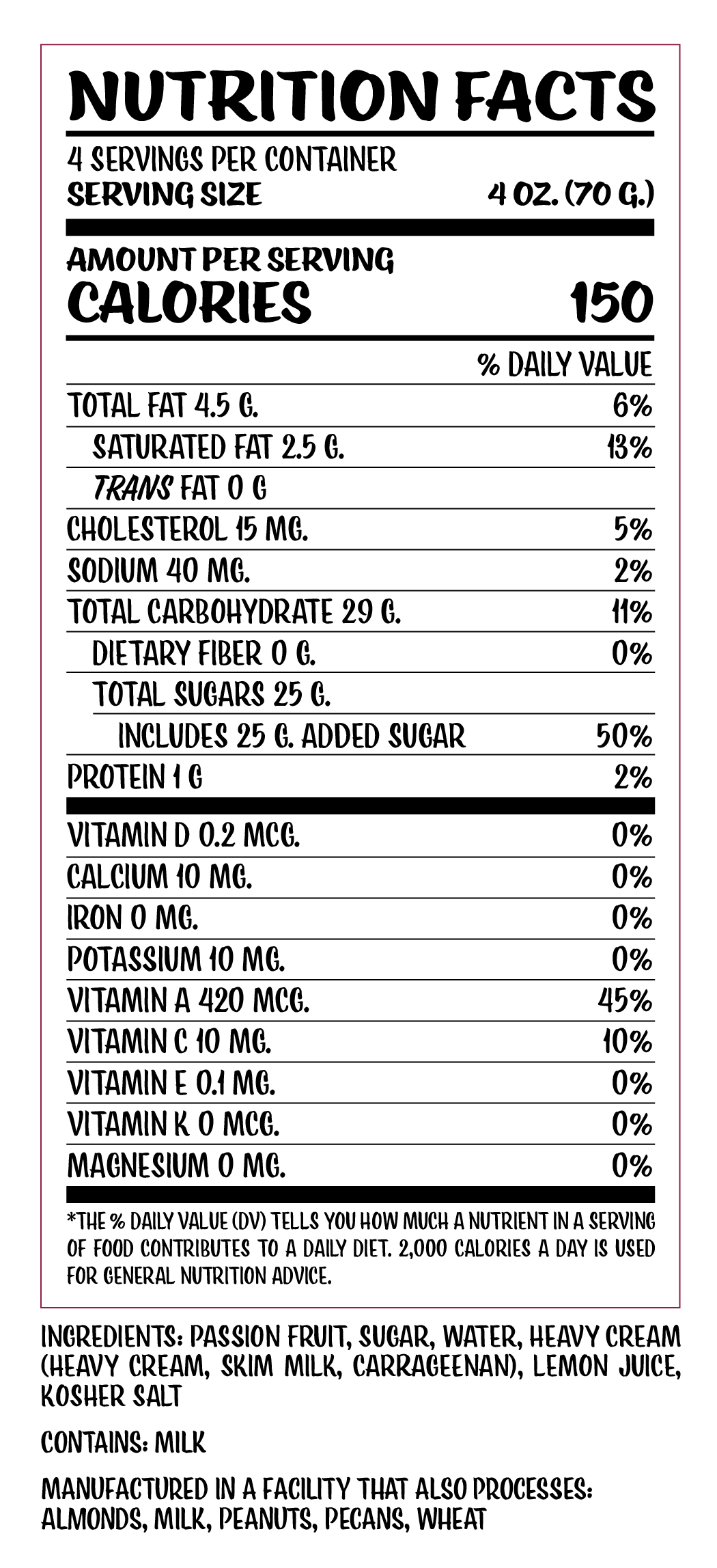 water, sugar, passion fruit, heavy cream (heavy cream, skim milk, carrageenan), lemon juice, kosher salt