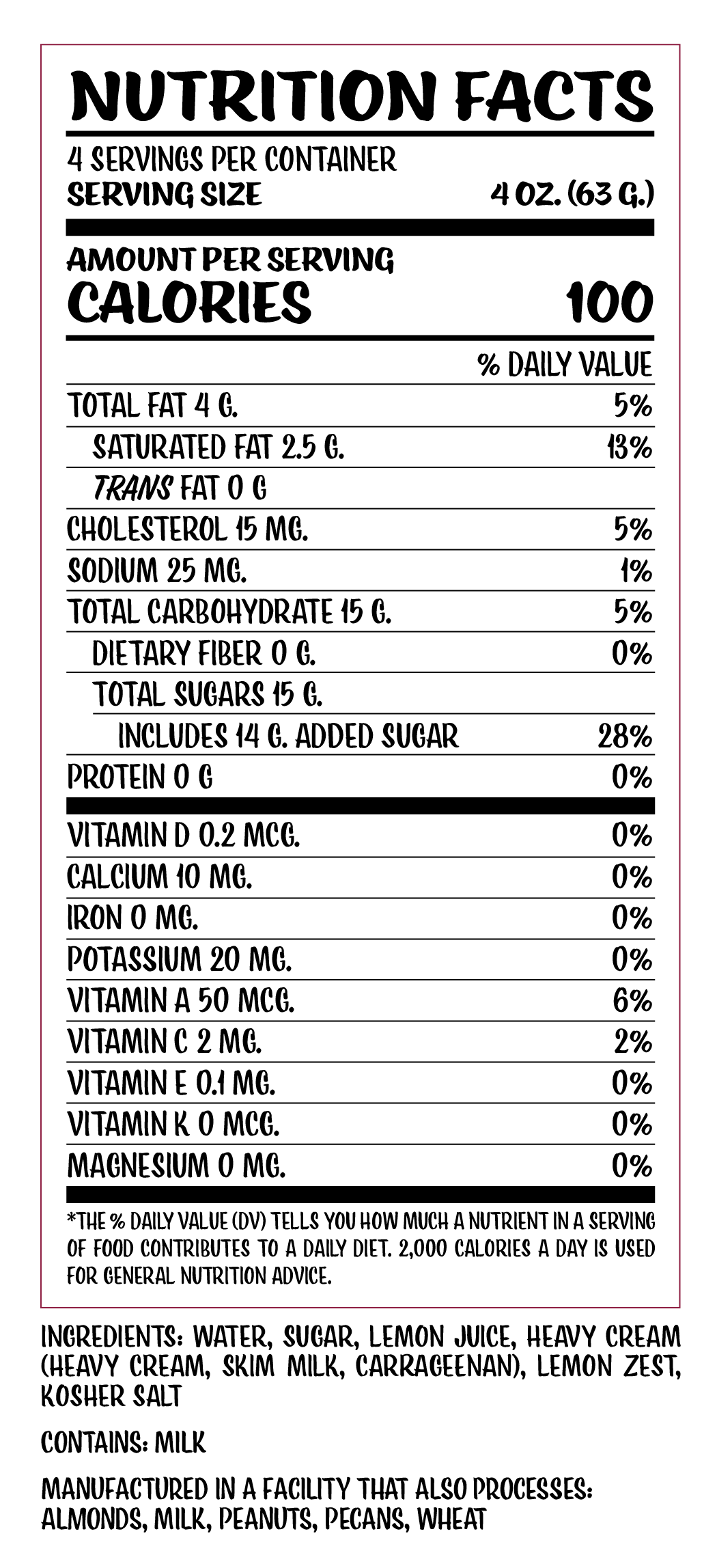 water, sugar, lemon juice, heavy cream (heavy cream, skim milk, carrageenan), lemon zest, kosher salt